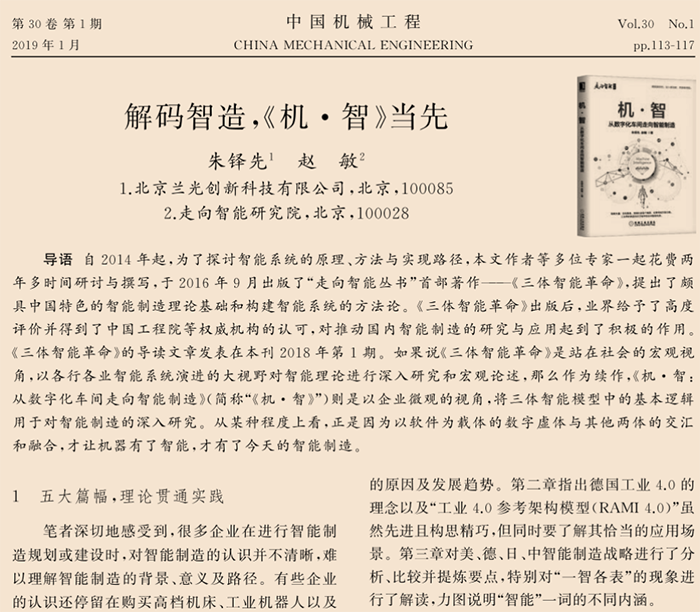 近日,由北京兰光创新科技有限公司朱铎先董事长与走向智能研究院执行院长赵敏教授撰写的《解码智造,当先》一文于《中国机械工程》2019年第一期发表。
