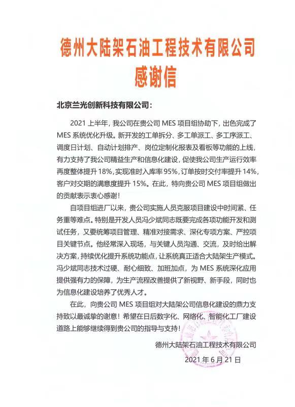 兰光创新收到来自德州大陆架石油工程技术有限公司的感谢信。
