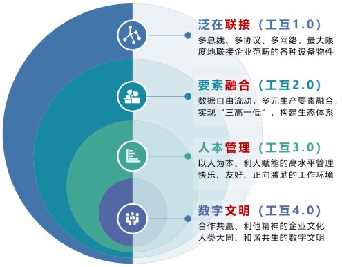 第三层为人本管理。这是企业不可或缺但往往被忽视的内容。在企业内,通过与工业互联网理念相匹配的思想、战略、组织、流程、人才队伍,建立以人为本、利人赋能的高水平管理,塑造快乐、友好、正向激励的工作环境;在企业间,基于诚信合作的精神,与客户、上下游合作伙伴建立合作共赢的生态模式。该层是工业互联网必须要实现的高阶内容。这在工业互联网发展水平上属于利人赋能,简称“工互3.0”。