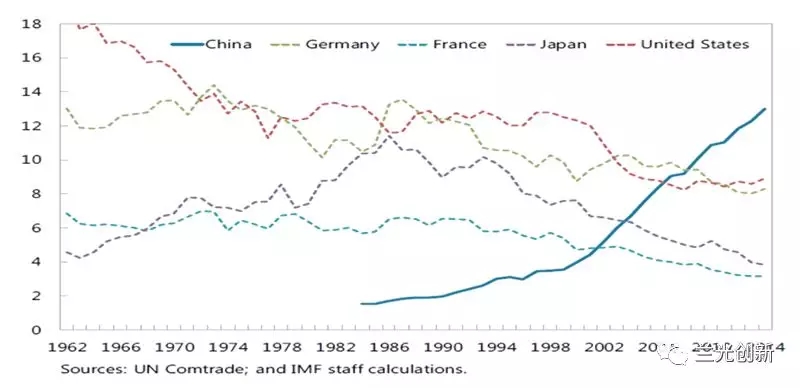 图4 主要工业国家出口在全球中的比重(来源:联合国和国际货币基金组织)