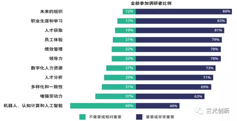 我们再看从全球视角看。德勤公司对全球140多个国家的一万多名企业高管进行调查,调查结果表明40%的高管和我们的认知是一样的,就是关注机器人、认知计算和人工智能。但80%的高管关注的什么呢?是人才获取、员工的培养培训和组织的重构,这才是这些顶级企业高管所关注的事情。