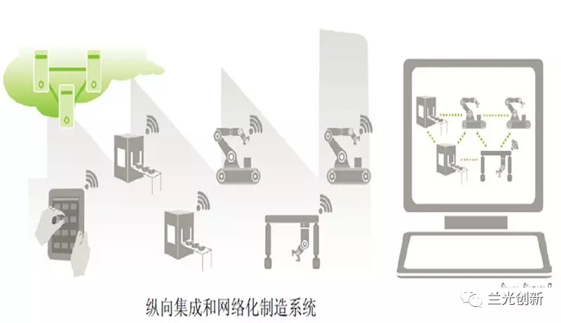 我们再看德国人提出的工业4.0,其中三项集成的第一项是纵向集成,是工业4.0的基础。德国人在图中央用大量的篇幅画了很多生产设备,这些生产设备是带Wi-Fi的,这代表生产设备的互联互通。右边你会看到一个电脑里面有很多用虚线连接的生产设备,是表示生产设备在互联互通的基础上与信息化系统深度集成,实现虚实两个世界的深度融合,打造车间级和企业级的CPS系统,这也可以理解为将车间内的“聋哑傻”设备、岗位通过互联互通,实现一种耳聪目明(Smart)的生产与管理模式。