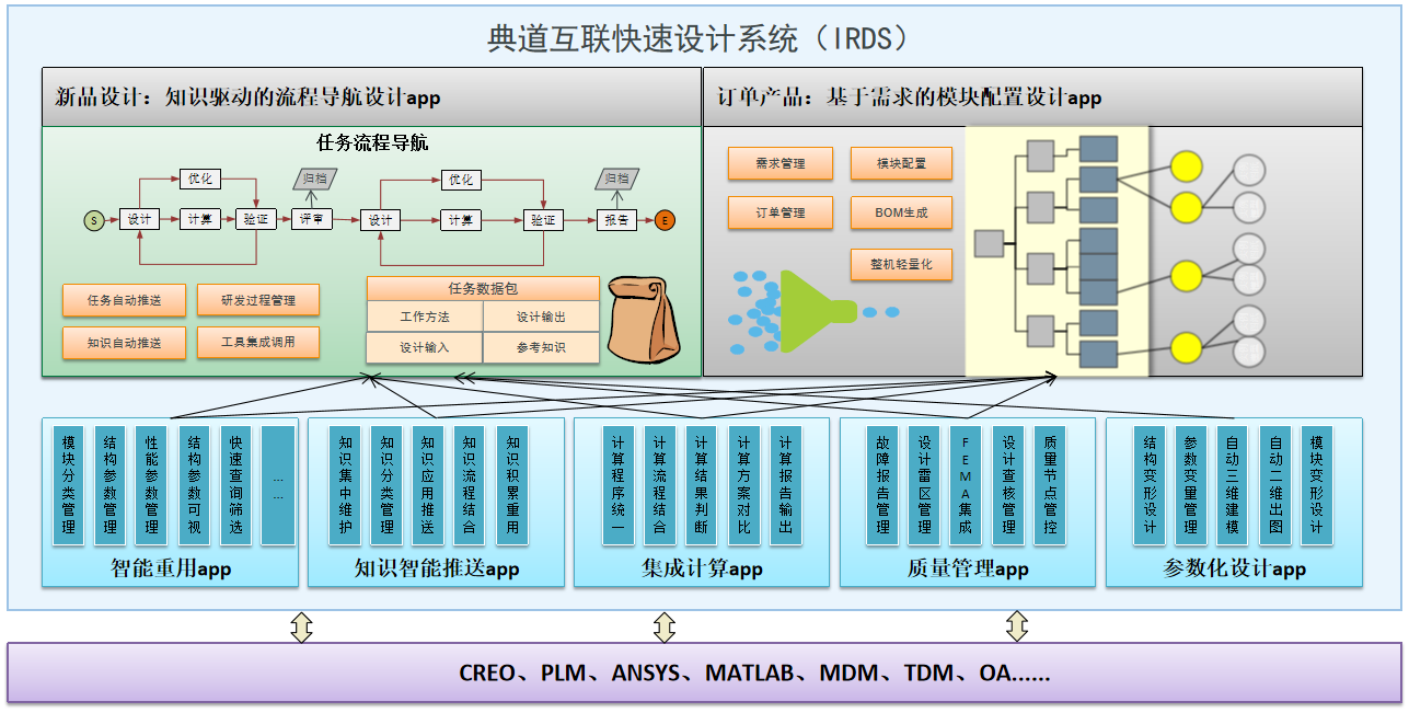 北京典道互联科技有限公司研发的快速设计系统(IRDS)就是这类工业APP的典型代表。该系统基于产品研发过程中可共享的产品要素及技术要素,运用数字化手段建立产品研发APP,实现各类要素可重复、快速的运用。系统包含了三维参数化设计、智能数据重用、集成计算组件、知识智能推送、导航式设计等多类工业APP应用。该系统已在中车、航天科工、兵器、潍柴、三一重工多个集团单位成功应用,并产生了很好的经济与社会效益。