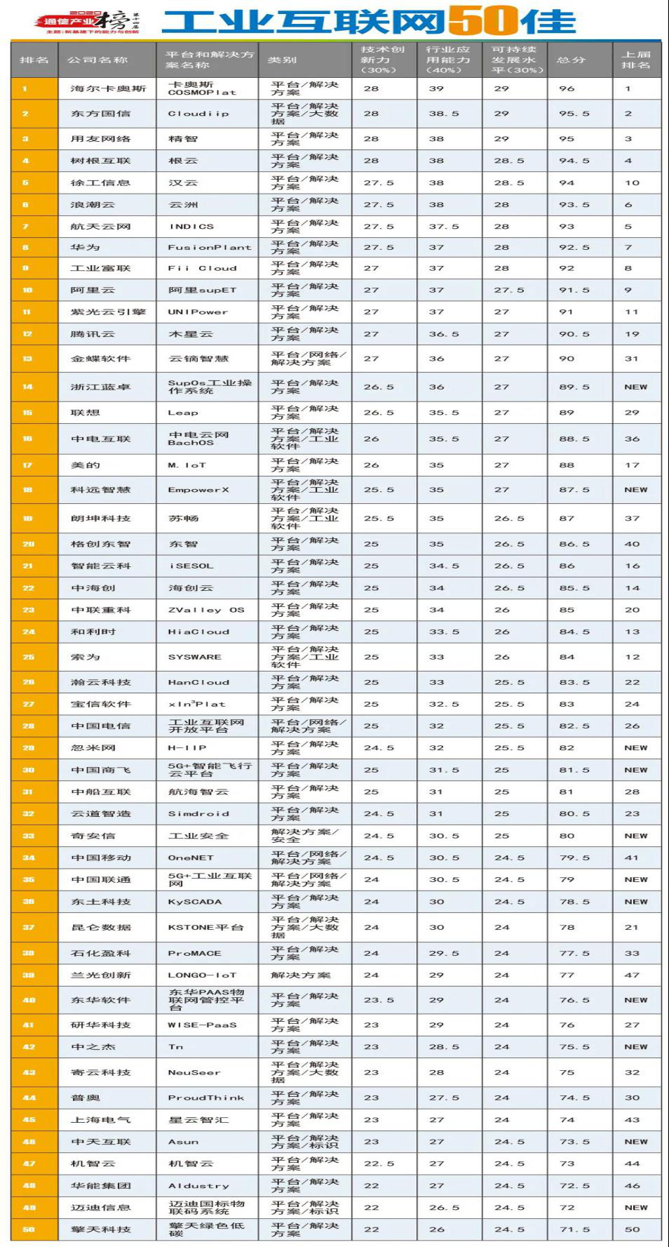 “工业互联网50佳”榜单