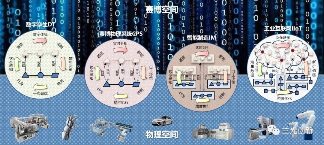 在赛博、物理两大空间占比上,四个术语有微妙差异,数字孪生体始于IT领域,赛博空间占比偏多;CPS强调数字虚体与物理实体深度融合,赛博、物理相对平衡对等;智能制造基于智能工厂,以CPS实现对物理系统的精确控制,物理空间占比稍高;工业互联网以基于云的新价值链网来泛在联接工业要素和强化工业数据的采集与处理,赛博空间占比略多。这是一个虚实相互融合、占比交替占优的演变过程。图5中四个大圆圈位置高低不同,粗略地展示了这一演变趋势。