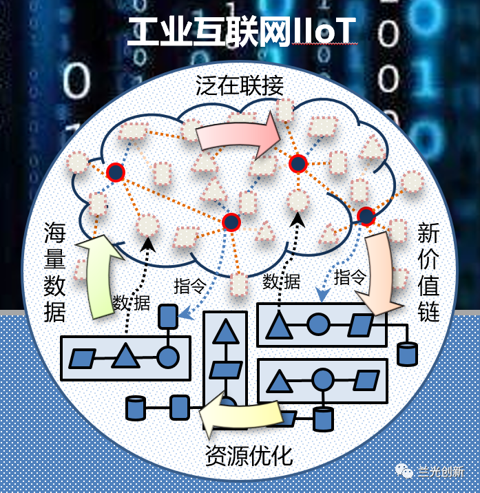 在图4中,高度类似于智能制造,数字孪生、CPS都同时存在。但是不同之处在于,智能制造聚焦于制造领域,以智能工厂为单元,其所联接的终端以企业(不限于本地)边界内部的设备和在制品为主;而工业互联网的联接范围从一开始就不局限于企业边界,而是以价值链甚至是以价值网作为起点,直面“三大”需求,联接企业内外部要素,特别是在用工业品,向基于云的新价值链网发展: