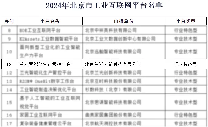 日前,北京市经济和信息化局发布了2024年北京市工业互联网平台名单,兰光创新申报的“兰光智能化生产管控平台”成功入选行业特色型工业互联网平台。