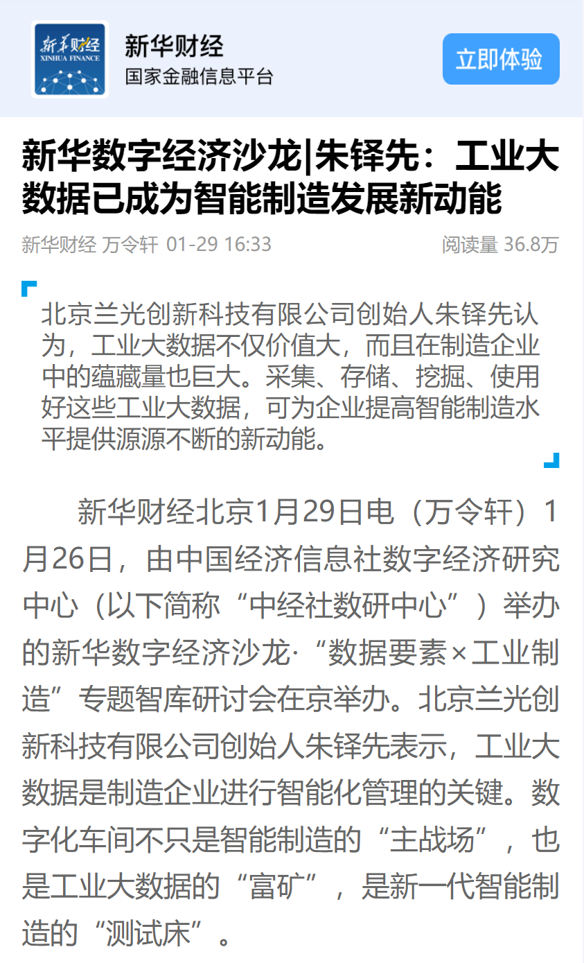近日,新华财经在其平台上连续发表两篇重要报道,聚焦北京兰光创新科技有限公司、机智互联(北京)科技有限公司创始人朱铎先在“新华数字经济沙龙·数据要素×工业制造”专题智库研讨会上的相关观点。朱铎先的发言指出,工业大数据已成为推动智能制造发展的新动能,引起了业界的广泛关注和讨论。