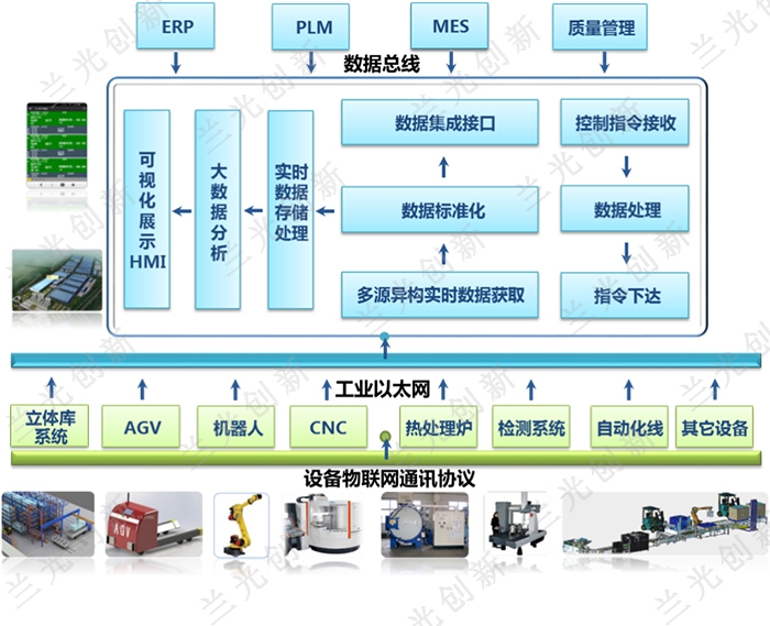 兰光设备物联网系统是北京兰光创新科技有限公司基于十多年设备联网研发及实施经验,在600余家航空航天等成功案例的基础上,以“中国制造2025”为宗旨,参考德国工业4.0及美国GE工业互联网等先进理念,为中国制造企业量身打造的设备智能化互联互通系统。本系统既包括传统意义上的DNC(机床联网)、MDC(机床监控与数据采集)等功能,也包含对热处理设备、机器人、AGV(自动导引运输车)、自动化立体仓库等各类数字化设备的智能化管控,是工业互联网在制造企业的具体应用。请见图2。