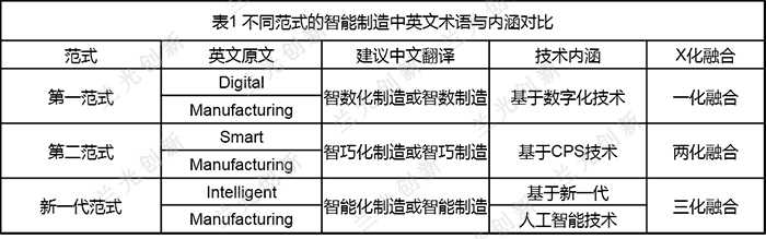 从表1可以看出,工程院报告中的“三范式”的表述,确实博采众家所长,对德、美等国的工业发展战略和智能制造参考架构模型进行了最大程度的融会贯通,同时又提出了可以占全球领学术高地的“基于新一代人工智能的新一代智能制造”。经过笔者对比研究,认为三个智能制造基本范式与三个融合恰好一一对应。在“建议中文翻译”条目中,笔者也把最新的研究内容添加进去,形成了在术语上自成体系、彼此不会混淆的智能制造范式名称:智数制造、智巧制造、智能制造。