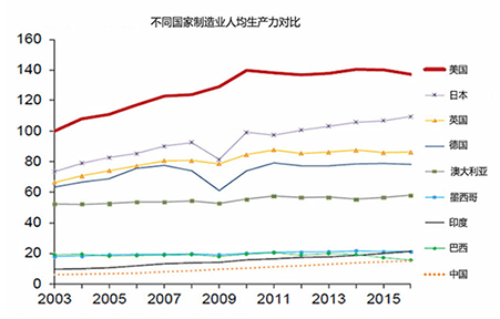 让中国制造企业倍感苦恼的是,一方面中国人工成本快速提升,但另一方面,在人均产出上却远低于美国、日本、德国等发达国家,甚至低于巴西、印度等发展中国家,请见图10。两者形成利润剪刀差,严重地挤压了中国制造业的发展空间,这也是近些年来,很多中国制造企业一直苦苦挣扎在生死线上的一个重要原因。