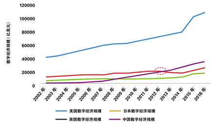 中国信息化百人会发布的《2017中国数字经济发展报告》认为,在全球信息化进入全面渗透、跨界融合、加速创新、引领发展新阶段的大背景下,数字经济长足发展,正成为创新经济增长方式的强大动能。并举例说,2016年全球发达国家(美、日、德、英)数字经济占GDP比重在50%左右,美国数字经济规模排在全球首位,已超10万亿美元,占GDP比重超58%。