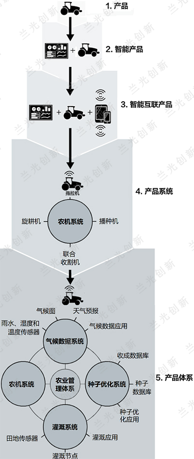 约翰迪尔是全球领先的工程机械、农用机械和草坪机械设备制造商,在面对激烈的全球化竞争中,该公司率先在数字化、网络化、智能化方面进行了成功转型,并打造出了全球领先的工业互联网系统。 2014年10月,被称为“全球竞争战略之父”的哈佛大学教授迈克尔•波特,与美国PTC(参数技术公司)总裁詹姆斯•贺普曼在《哈佛商业评论》上联合发表了《物联网时代企业竞争战略》一文,对农机行业百年老店约翰迪尔基于工业互联网的转型进行了深入研究与详细阐述。迈克尔•波特将产品发展定义了五个阶段,如图2: