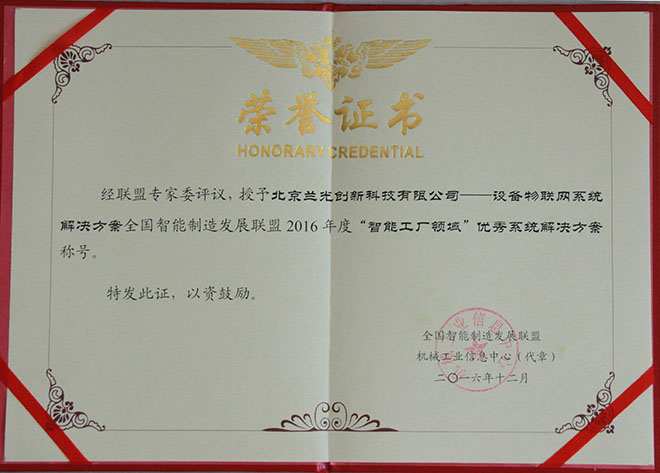 演讲环节结束后,联盟为2016年度智能制造系统解决方案进行了颁奖。这次评选联盟聚焦的是智能制造领域系统解决方案提供能力,并以智能工厂领域、智能服务领域、智能工业链领域、制造新模式领域的应用核心要素为标准,遴选出国内一批具有自主提供能力的行业系统解决方案案例和系统集成商。兰光创新凭借着设备物联网系统解决方案获得了“智能工厂”优秀系统解决方案这一奖项。