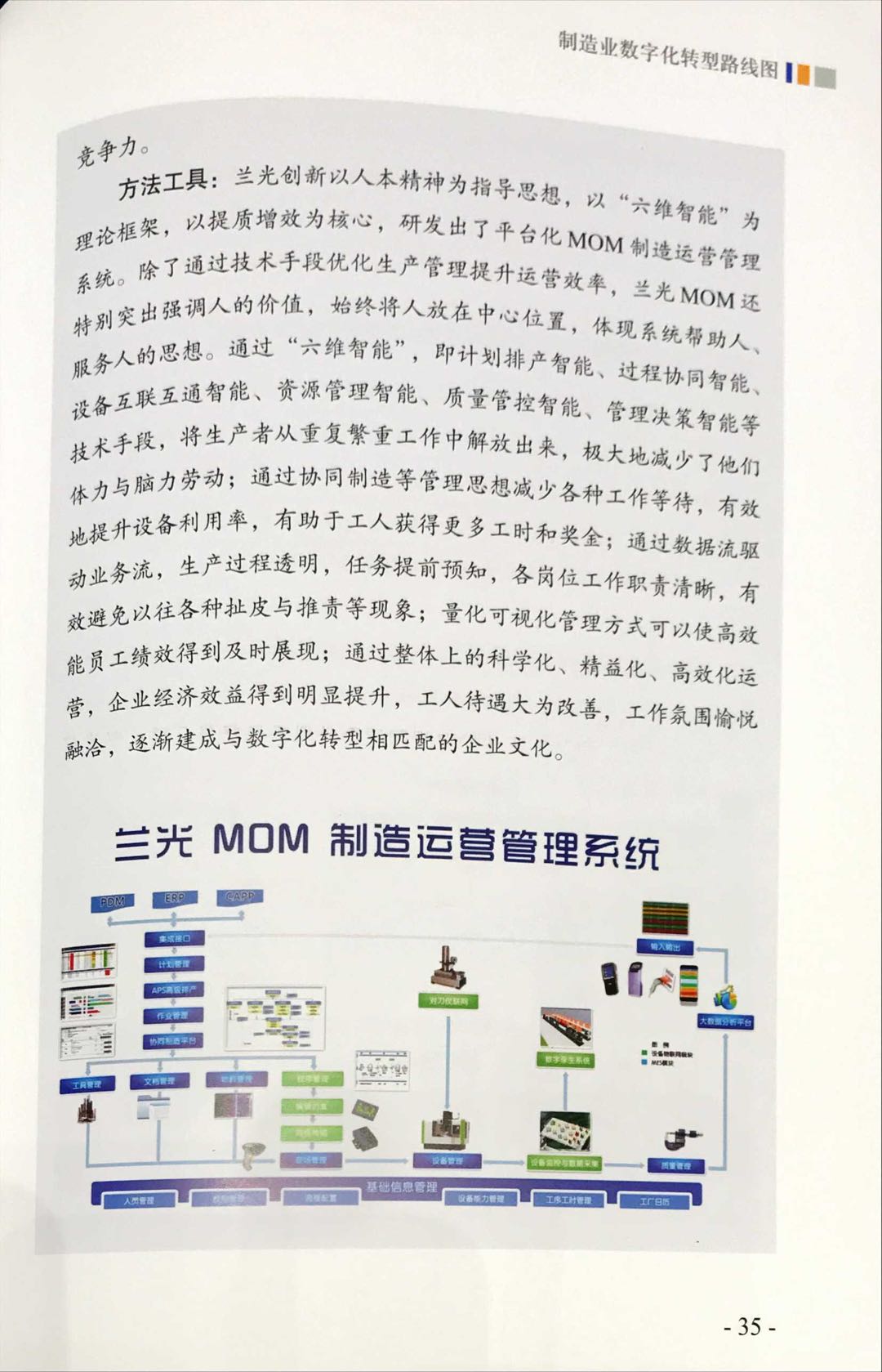 兰光创新自成立十九年以来,一直致力于制造企业数字化转型升级,并沉淀了大量领先的理念和行业案例,兰光MOM作为数字化转型典型解决方案成功入选白皮书。