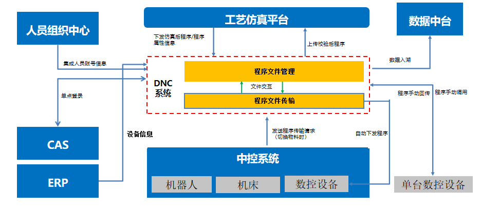 本次建设的DNC系统,通过集成建设成三一集团信息化平台的重要组件。以DNC系统平台为核心,向下承担着与中控系统和底层设备之间的通讯,向上接收工艺仿真平台的模拟仿真后程序,反馈实际加工验证的程序;周围拓展与三一集团PSM、中控、CAS、ERP、数据中台、人员组织中心系统集成,实现统一身份认证、组织用户同步、流程签审、程序自动调用、设备信息同步等。
